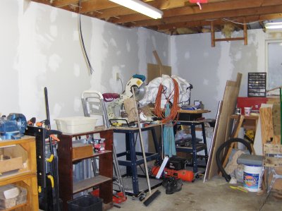 Is a garage ever really done? Here at our house we don't see it. To us it keeps getting better. There are always new tools and wood to buy. As I write this it is Jan 2008 and not much is done in the garage. When the warm weather returns the walls will be painted and the tools will be sorted and organized. There will be a new counter built under the back window and some shelving. The deck which is on top will be rebuilt and there will be time in the future for some relaxing and some more time for "Wheelers Almost Fine Furniture". We call it that because we know there is always a flaw somewhere and hey if there is more than one you forget where they are and don't worry about it. |